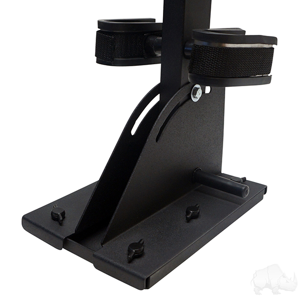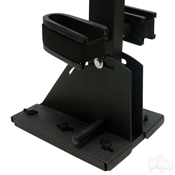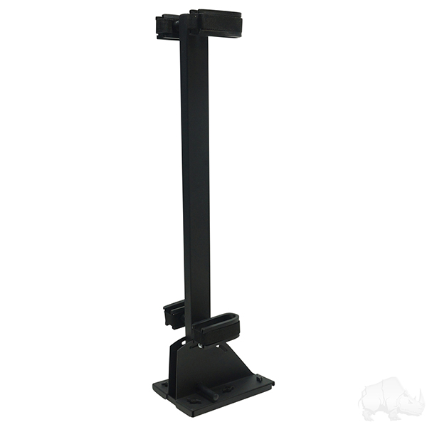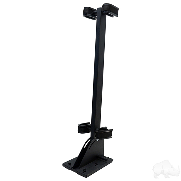 Holds one or two guns while you drive. Perfect for hunters. Powder coat painted, Heavy duty construction. Mounts to the floor of any golf cart.